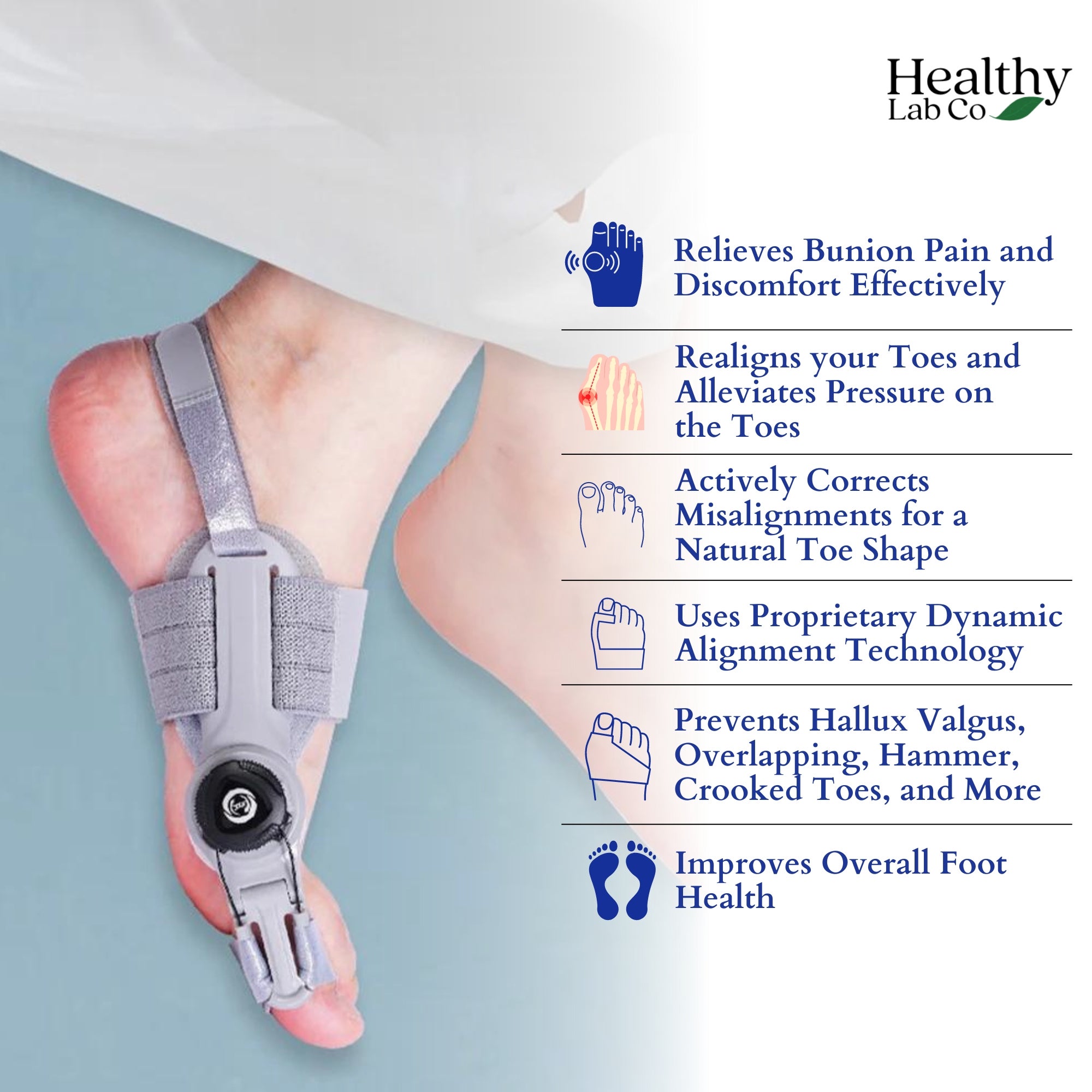 The FlexiToe Bunion Corrector Brace actively corrects misalignment and prevents issues like hallux valgus, overlapping toes, hammer toes, crooked toes, and other foot problems.