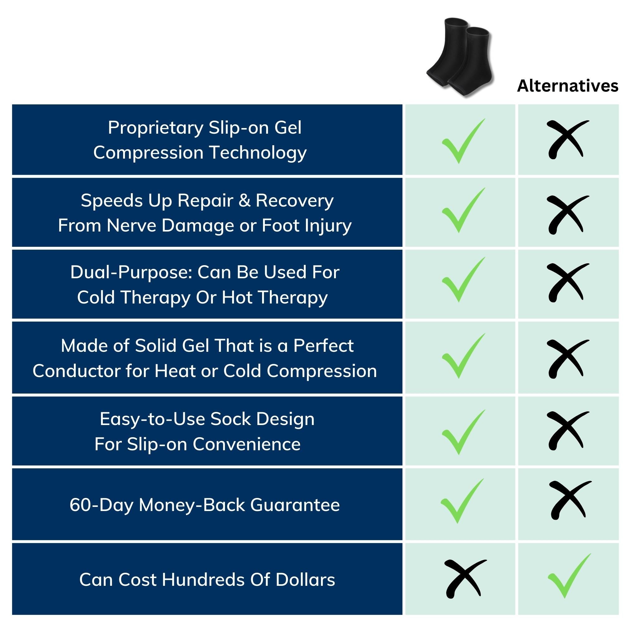 "The Foot & Ankle Gel Wrap uses a proprietary Slip-on Gel Compression Technology. It applies hot or cold compression therapy to either increase or decrease blood flow and promote healing from injury. A cold compress constricts the blood vessels to restrict the transport of inflammatory chemicals and cells to the injured site. A hot compress, on the other hand, increases blood circulation to allow nutrients and speed up the repair and recovery of damaged nerves. Alternating between hot or cold compression therapy helps quickly eliminate foot neuropathy.”