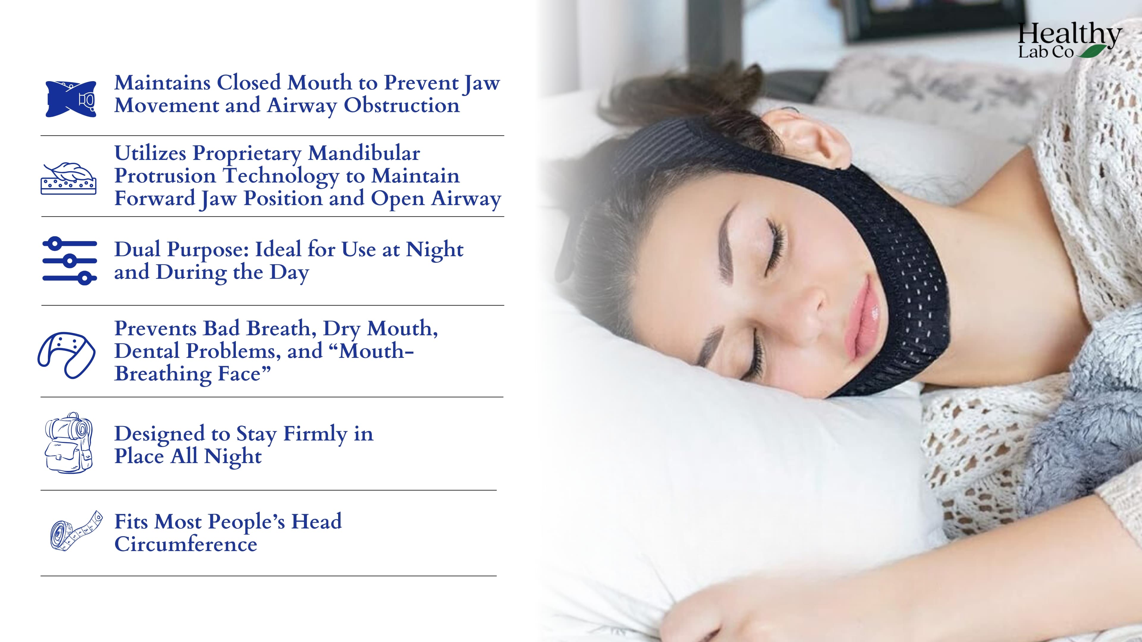 Preventing the jaw from sliding backward will stop the tongue from blocking the airway, allowing air to pass easily and preventing throat vibrations and breathing disruptions.